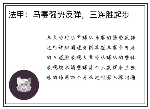 本文将对法甲球队马赛的强势反弹进行详细阐述,分析其在本赛季开局的三连胜表现。文章将从球队的整体表现、战术调整、球员个人发挥和主教练的作用四个方面进行深入探讨。通过对这些方面的分析,我们将揭示马赛为何能...